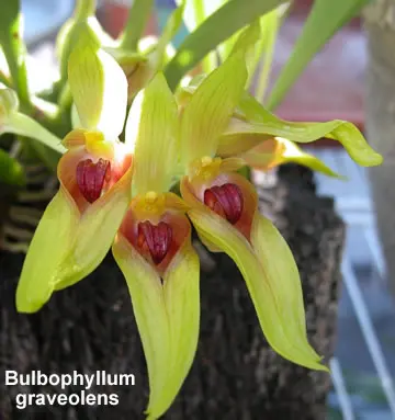 | Bulbophyllum graveolens A species from New Guinea and does best under warm to intermediate conditions with bright filtered light. A basket or mount will best accommodate the sprawling growth habit. Sepals and petals are pale green and the labelum red. |