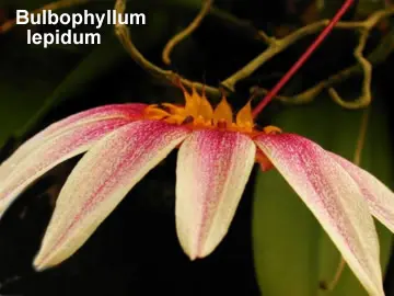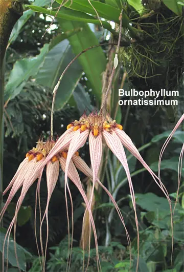 | Bulbophyllum ornatissimum Distributed from India to Nepal. This orchid prefers intermediate temperatures, it will thrive in a basket where the long lateral sepals can dangle |