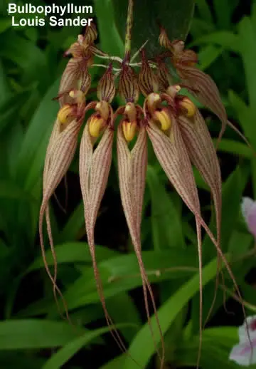 | Bulbophyllum louis sander Primary Hybrid: (Bulbophyllum longissimum x Bulbophyllum ornatissimum) developed in 1936 |