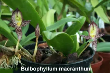 | Bulbophyllum macranthum Distributed from Assam to Indo-China and Solomon Is. A warm grower, give good sunlight to promote flowering. In active growth, give plenty of water and fertiliser. Some winter rest with slightly drier conditions. |