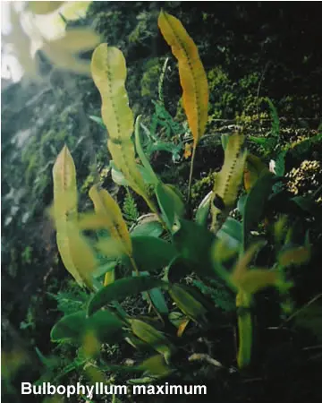 | Bulbophyllum maximum Accepted name Bulbophyllum virescens Found in all of tropical Africa as a hot to warm growing, bifoliate epiphyte and an occasional lithophyte in open woodlands and riverine forests at elevations of 600 to 2100 meters with oblong to ovoid pseudobulbs carrying to 3, apical, oblong, apex rounded and emarginate thick and leathery leaf that blooms on a single, basal, erect, 20" [50 cm] and more long, inflorescence arising on a mature psuedobulb with many [50], small, successive opening flowers spread out along the leaflike, flattened rachis with dentate edges occuring in the fall. This plant needs a distinct dry period in the winter as you do need some pseudobulb shriveling for strong growth to come on in the spring |