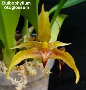 | Bulbophyllum otoglossum Found from Nepal to China living on forest rocks. It has narrow oval pseudobulbs with rhizome creeping roots. Inflorescence stem is short with three or four flowers. |