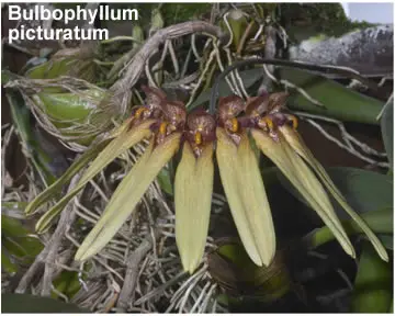 | Bulbophyllum picturatum Assam to Indo-China. Elongated, yellow flowers make a beautiful umbel on this intermediate, moderate light species. Sends out multiple spikes at least twice a year. Likes it on the humid side. Grow in a basket |