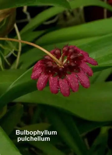 | Bulbophyllum pulchellum Distributed from Thailand to Borneo it makes loads of very nice red whols which almost resemble fruits. These can make very nice displays as the plant gets larger and are super as basket plants.It will do best in warm to intermediate conditions under medium to low light and does fine in pure NZ moss or mounted on tree fern. |