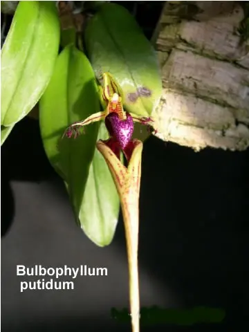 | Bulbophyllum putidum Syn.Mastigion putidum. Single long flowers with mobile lip & protruding hairs. Dorsal & petals have purple tassles, sepals elongated fusing then separating. Grow intermediate with moderate light |