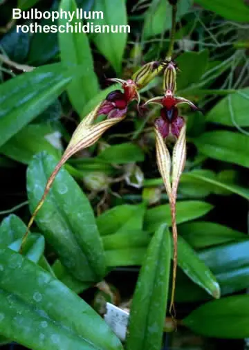 | Bulbophyllum rothschildianum Found in India & the Himalayas. It produces long inflorences of three or more flowers produced from the base of the pseudobulb. The sepals are almost 15cm long and the flowering period is from September to March. |