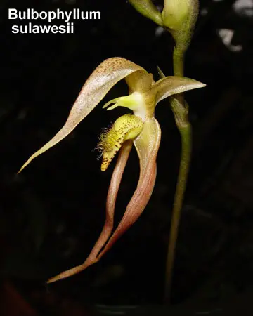 | Bulbophyllum sulawesii This species is found on the island of Sulawesi at between 1200 to 1500m. The pseudobulb has a single leaf and usually bears around 10 flowers which open successively in during spring and summer. Found in rainforest as an epiphyte, grow in warm conditions. |