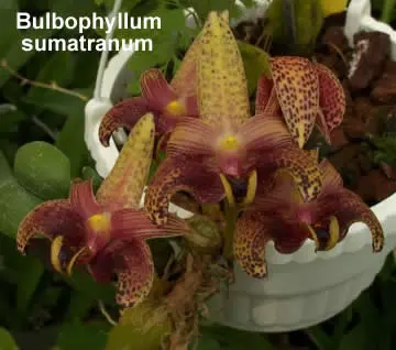 | Bulbophyllum sumatranum Found in Sumatra as a warm growing epiphyte that requires shade, and high humidity. This large-flowered species has yellow or ivory sepals with dark red-brown spots. The petals are yellow to cream with red-brown stripes, and the lip is red-purple edged in yellow. |