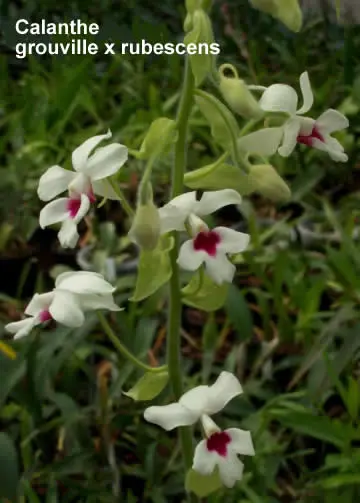 | Calanthe grouville The plants form large palm-like light green leaves in the growing season (Spring into Summer) and go decidiuous in the Fall to Winter season. It is at this time that the majestic spikes develop, reaching up 50cm before cascading downward for a stunning display. The flowers last for months when bloomed under cool and dry conditions, at which time watering should be done sparingly; once every 2-3 weeks. |
