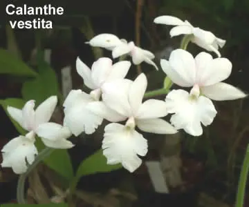 | Calanthe vestita Native of Indo-China, Malesia to New Guinea. The plants form large palm-like light green leaves in the growing season (Spring into Summer) and go decidiuous in the Fall to Winter season. It is at this time that the majestic spikes develop, reaching up 100cm before cascading downward for a stunning display. The flowers last for months when bloomed under cool and dry conditions, at which time watering should be done sparingly; once every 2-3 weeks. |