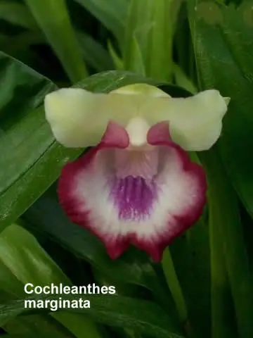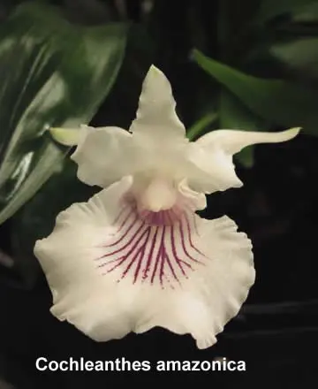 | Cochleanthes amazonica Occuring in the Amazon basin, this plant produces the largest flowers of the genus, some 75 cm. The flowers are white with purple vein lines in the lip. |