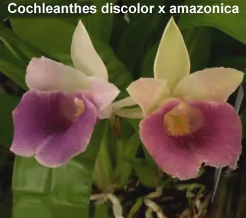 | Cochleanthes discolor x amazonica These plants are epiphytes from the cloud forest that like intermediate conditions and plenty of moisture. Although the flowers appear singly, can appear throughout the year, more during summer and fewer in winter. Definitely no dry winter rest. |