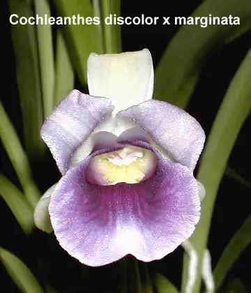 | Cochleanthes discolor x marginata These plants are epiphytes from the cloud forest that like intermediate conditions and plenty of moisture. Although the flowers appear singly, can appear throughout the year, more during summer and fewer in winter. Definitely no dry winter rest. |