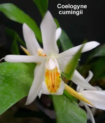 | Coelogyne cumingii Warm growing epiphyte that blooms in spring & summer. The inflorescence carries several fragrant white to cream with gold lip flowers. |