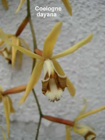 | Coelogyne dayana Native to the island of Borneo, this beautiful species has tapered conical pseudobulbs that are 28cm long. The bifoliate, long, stiff, pleated leaves are about 50cm in length. The flower spikes emerge several times per year and can be up to three feet or more in length. The flowers have a pleasant fragrance. |