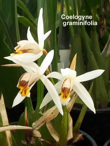 | Coelogyne graminifolia synonym of Coelogyne viscosa. Distributed from Assam to China (SW. Yunnan) and Pen. Malaysia. A Pseudobulb epiphyte growing on the intermediate side with moderate light. Likes lots of water in its growing period. Produces 5 - 6 flowers per inflorescence during late spring into summer. |