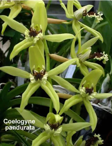 | Coelogyne pandurata Distributed from Malaya, Sumatra, Borneo, and the Philippines on Mindanao, Luzon and Samar Islands. They generally grow on old trees by rivers, near the coast, or in hot, damp, swampy lowlands.Fragrant flowers up to 120mm across and up to 15 per inflorescence, on well grown plants. |