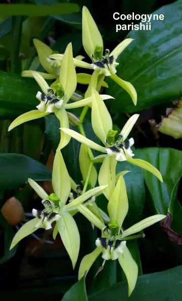 | Coelogyne parishii Lower Burma. Flowering March-June. they need warm to Intermediate conditions similar to pandurata, but has smaller flowers and less lip ornamentation. |