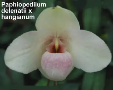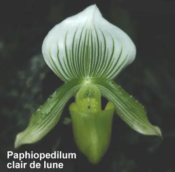 | Paphiopedilum clair de lune One of the oldest types of paphiopedilum hybrids is none other than the ubiquitous green-and-white "albino" Maudiae-type paphs. Certain plants have been in cultivation for the greater part of the 20th century. Clair de Lune cultivars are characterized by their ease of growth and their absolutely enormous flowers that can measure up to 15cm in natural spread. As a result, it carries an AM/AOS to its credit. |