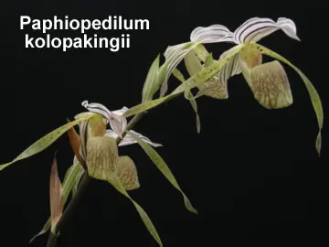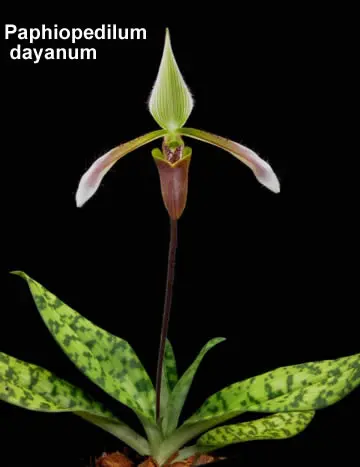 | Paphiopedilum dayanum This fabled orchid is endemic to Mount Kinabalu in Northern Borneo. It has strongly contrasting patterned leaves, a purple pouch and a green stripped white dorsal sepal. Flower period is Summer. The fact that it is limited to a very small area in nature makes it particularily vulnerable to habitat destruction and commercial orchid collecting. Naturally our orchids are home grown. |