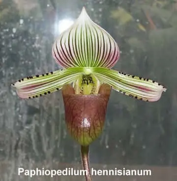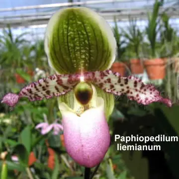 | Paphiopedilum insigne This species is native to Nepal and northeast India. A well known and well used plant for modern hybrid breeding, it is a vigourous grower and quicky forms specimen plants. It flowers in autumn into winter. |